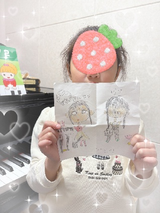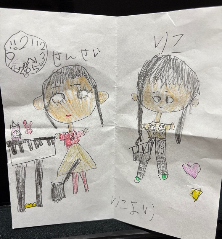 入会半年になる年長さん。レッスンの最後に、お手紙をくれました❗️先生はお化粧して、パッチリおめめ👀ピアノも上手に描けていて、時計もレッスン時間になっていました。子供ってよく見ていますね〜レッスンも両手に入り、順調に進んでいます♪