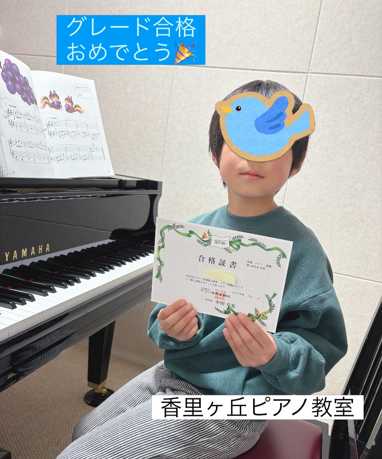 グレード合格、ぞくぞく増えています😃ヤマハグレード10級合格おめでとう🎉なんとA判定の高得点!自由曲では、どんな風に弾きたいか伝わる演奏でしたと高評価頂きました。手を丸く意識して綺麗な音を出すようになったね。譜読みがよく出来るピアノ男子くん。これからも色んな曲を楽しみましょう😊